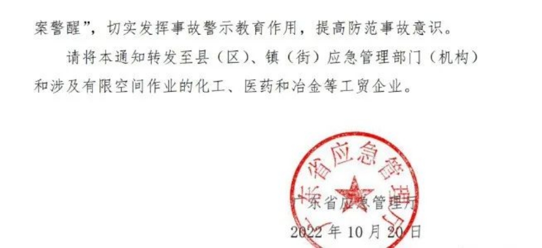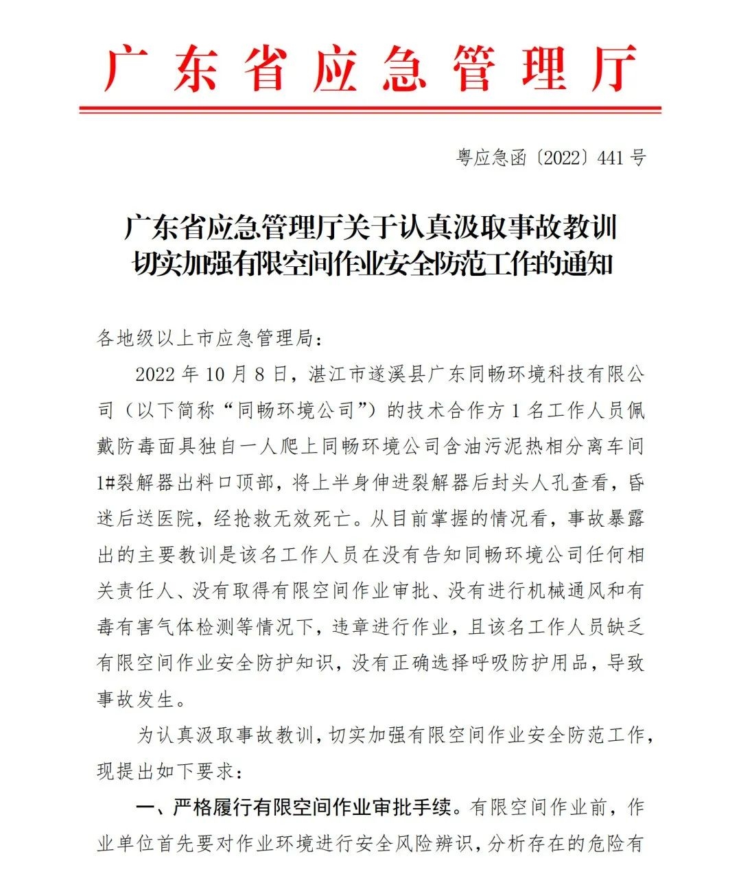 廣東省應(yīng)急管理廳發(fā)布《關(guān)于認(rèn)真汲取事故教訓(xùn) 切實(shí)加強(qiáng)有限空間作業(yè)安全防范工作的通知》,通報(bào)2022年10月8日,湛江市某環(huán)保公司的合作方員工私自進(jìn)入有限空間,不幸中毒身亡。