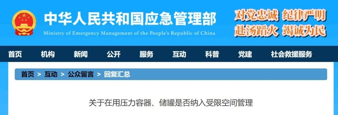 回復(fù): 感謝您的留言。壓力容器監(jiān)管非我局職責(zé)。對(duì)工貿(mào)行業(yè)內(nèi)的儲(chǔ)罐,如果企業(yè)經(jīng)風(fēng)險(xiǎn)辨識(shí),確定不存在有毒有害、易燃易爆物質(zhì)積聚或氧含量不足的情況,可不作為有限空間管理。回復(fù)單位: 安全執(zhí)法和工貿(mào)監(jiān)管局 回復(fù)時(shí)間: 2022-04-28