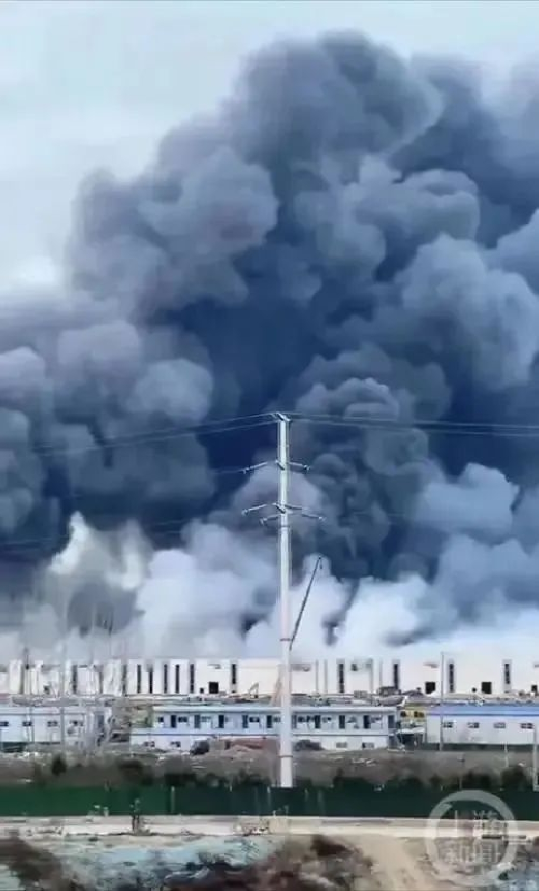 工地起火后,廠區上空彌漫著大量黑煙,現場還有大量濃煙從廠房中竄出。