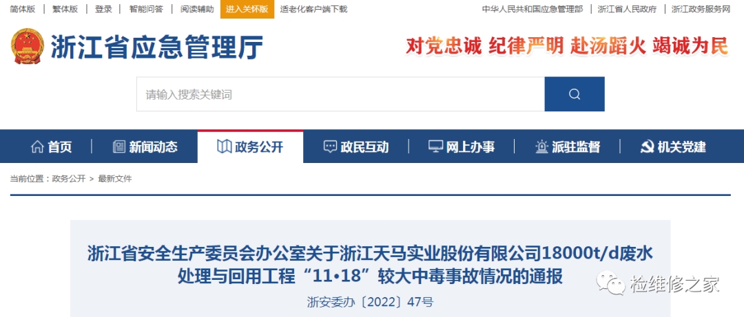 2022年11月18日16時許,浙江鑫廣環??萍加邢薰驹诮B興市柯橋區浙江天馬實業股份有限公司18000t/d廢水處理與回用工程試運行作業時,發生人員中毒,造成4人死亡、2人受傷。經初步調查,浙江天馬實業股份有限公司主要從事紡紗、織造、印染及后整理加工,事發廠區于2020年投產,2021年7月與湖北鑫嘉鴻誠環??萍加邢薰荆ㄒ韵潞喎Q鑫嘉鴻誠)簽訂了18000t/d廢水處理與回用工程建設工程合同,由鑫嘉鴻誠總包并負責土建施工,由浙江鑫廣環??萍加邢薰矩撠煿に囋O計和運維,目前工程處于試生產調試階段。11月18日下午,工程總包方鑫嘉鴻誠施工負責人帶領10余名員工進行設備調試,發現氯化亞鐵儲存池往外輸送的管道發生堵塞,于是決定通過抽取厭氧池中的污水對管道進行沖洗,清理堵塞物。經多次沖洗無果后,現場1名作業人員在未通風、檢測及無任何防護措施的情況下,通過儲存池人孔進入池中,中毒倒地,其余5人盲目施救,相繼中毒,導致事故擴大。