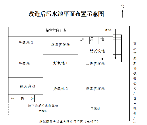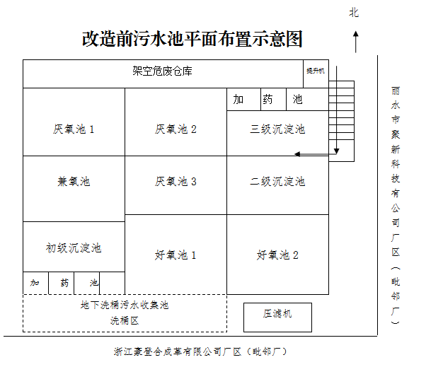1.污水池項(xiàng)目。可思克公司產(chǎn)生的廢水主要為設(shè)備清洗廢水、成品包裝桶清洗廢水、地面沖洗廢水等,產(chǎn)生的廢水經(jīng)處理后大部分回用于生產(chǎn)車間,基本不外排。該公司主要原輔材料包括順丁烯二酸酐、馬來酸、醋酸乙烯、苯乙烯、山梨醇、乙二醛、馬來酸、糊精、丙烯酸丁酯、淀粉、尿素等。根據(jù)《浙江可思克高新材料股份有限公司年產(chǎn)40000噸造紙化學(xué)品搬遷擴(kuò)建項(xiàng)目竣工環(huán)境保護(hù)驗(yàn)收監(jiān)測(cè)報(bào)告(QX(竣)2018048)》,公司生產(chǎn)廢水各主要污染物產(chǎn)生濃度約為:COD1816mg/L、氨氮121mg/L、石油類1.11mg/L、SS 153mg/L、總氮182mg/L、苯乙烯0.54mg/L。根據(jù)企業(yè)原輔材料分析,企業(yè)廢水沉積物(污泥)里的有機(jī)物在厭氧處理單元硫酸鹽還原細(xì)菌(SRB)等厭氧菌作用下發(fā)酵分解產(chǎn)生硫化氫、甲烷等有害氣體。硫化氫(相對(duì)分子質(zhì)量為34)重于空氣(相對(duì)分子質(zhì)量為29)且較易溶解于水,故硫化氫容易在厭氧池內(nèi)沉積富集。企業(yè)厭氧池長期運(yùn)行未清理且表面板結(jié),導(dǎo)致硫化氫等有害氣體在厭氧池內(nèi)持續(xù)富集。該企業(yè)改造前污水處理工藝流程如下圖: