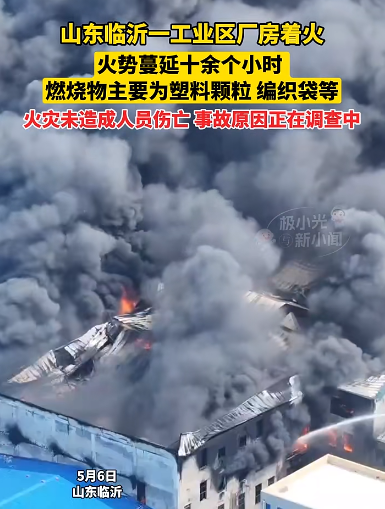 5月6日,山東臨沂一工業(yè)園區(qū)廠房發(fā)生火災,現(xiàn)場濃煙滾。經(jīng)核實,著火位置位于廠房建筑3層,燃燒物主要為塑料顆粒、編織袋等。截至15時30分,火勢被控制未造成人員傷亡。