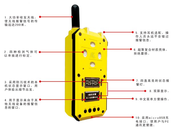 無線布控:本產品具有無線報警功能。將產品布置在危險源附近可實現200米半徑內與NANO、NANO4S、NANO-G3S無線聯動,實時警示危險級別,如選用多氣體探測器無線距離可達200米。