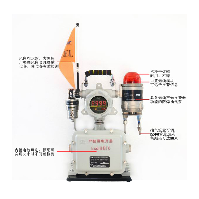 泵吸監測:可選配EP-40防爆抽氣泵,實現現場連續,泵吸式監測.(最遠長達50米)。用于密閉空間、井下、高空等,難以進入區域的監測。