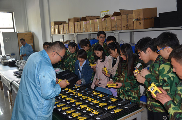 東方報(bào)警生產(chǎn)部部長(zhǎng)為學(xué)生講解我公司生產(chǎn)自動(dòng)化