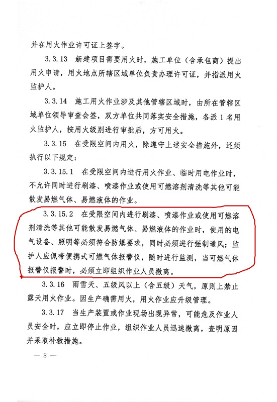 3.3.15.2中指出:在受限空間內(nèi)進行刷漆、噴漆作業(yè)或使用可燃溶劑清洗等其他可能散發(fā)易燃?xì)怏w、易燃液體的作業(yè)時,使用的電氣設(shè)備、照明等必須符合防爆要求,同時必須進行強制通風(fēng);監(jiān)護人應(yīng)佩戴便攜式可燃?xì)怏w報警儀,隨時進行監(jiān)測,當(dāng)可燃?xì)怏w報警儀報警時,必須立即組織作業(yè)人員撤離。如下圖。