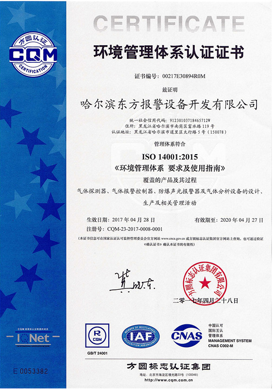 熱烈祝賀東方報警榮獲“環境管理體系認證證書”