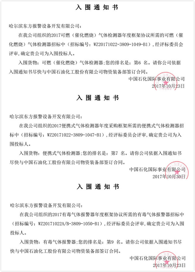 2017年10月19-20日,在中國石化國際事業有限公司組織的2017可燃、有毒、便攜氣體檢測器年度采購框架招標會上,哈爾濱東方報警設備開發有限公司憑借著對氣體檢測行業的專注,以及優異的產品品質、完善的國際國內認證、合理的價格、優質的服務,經評標委員會的綜合評定,成功入圍2017中國石化可燃、有毒、便攜氣體報警器年度采購框架!