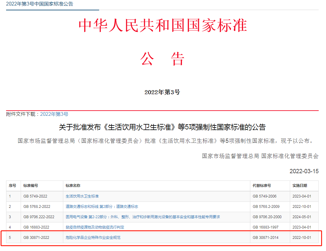 2022年3月15日,國家市場監督管理總局和國家標準化管理委員會聯合發布中華人民共和國國家標準公告(2022年第3號)“關于批準發布《生活飲用水衛生標準等5項強制性國家標準的公告》”,正式批準GB 30871-2022于2022年10月1日起實施。