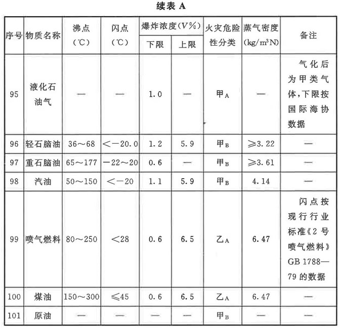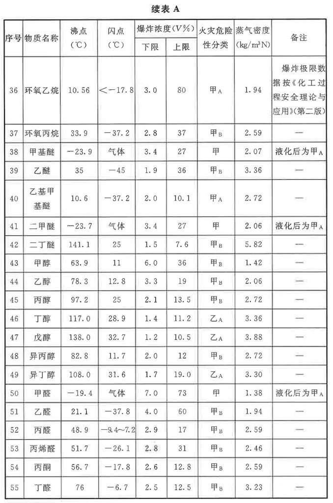 表A中的數值來源以《化學易燃品參考資料》(北京消防研究所譯自美國防火手冊)為主,并與《壓力容器中化學介質毒性危害和爆炸危險程度分類標準》HG/T 20660-2017、《石油化工工藝計算圖表》、《可燃氣體檢測報警器》JJG 693-2011、《爆炸危險環境電力裝置設計規范》GB 50058-2014、《化工過程安全理論與應用》(第二版)進行了對照,僅調整了個別欄目的數值。