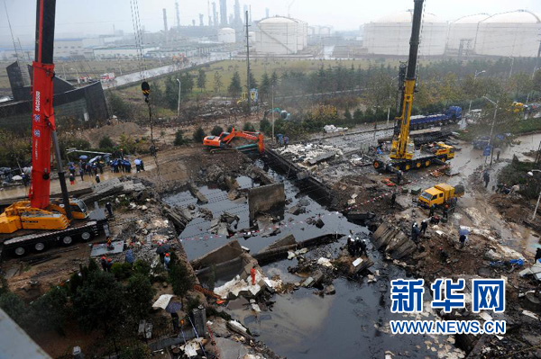 2013年11月24日拍攝的位于青島經濟技術開發區秦皇島路與齋堂島街交會處的事故現場。