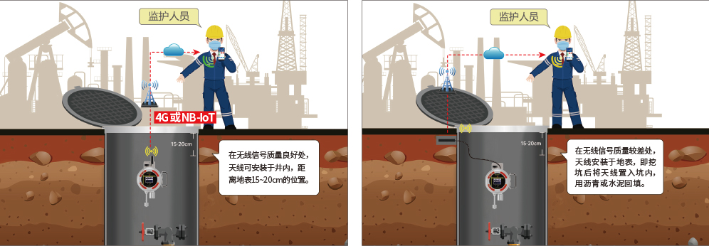 在井下實際應用過程中,傳輸信號好的情況下,可直接將檢測儀器安裝在井壁。如傳輸信號較弱,可將檢測儀器的天線通過連接線延長至傳輸信號較好的位置進行埋放,并用水泥或瀝青回填。